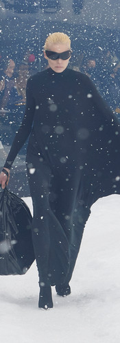 模特在狂風暴雪中踩著堅毅的步伐,儘管在凌亂的景象都讓人屏息,每一個畫面帶有著動感的激昂與情感的深刻連結,擅長以末日作為秀場靈感的 Demna 對於美好烏托邦的反其道而行,冷冽的狂風中出場的是各種黑色裝束,最後殘破不堪的蕾絲拖曳長裙與黃和藍的「希望」點綴,就算是在暗黑、末日主義也會因為愛與憐憫帶來正向的勇氣。